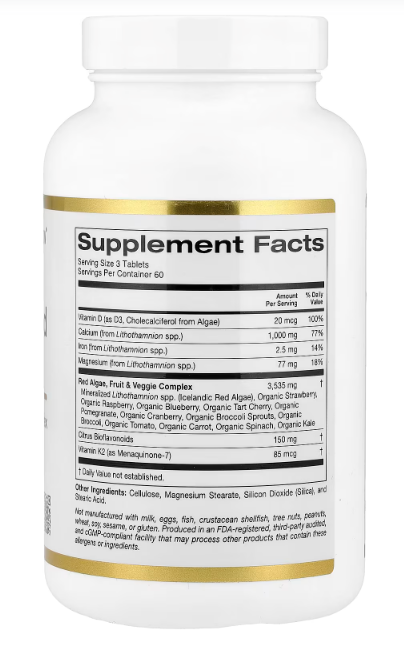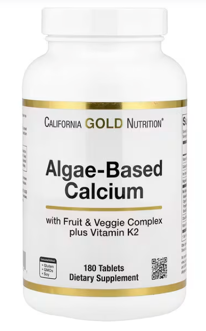 California Gold Nutrition® Algae-Based Calcium contains 1,000 mg of Calcium derived from Icelandic Red Algae. Each serving includes Vitamins D & K2, Magnesium, an Organic Fruit & Veggie Complex, plus Citrus Bioflavonoids.
